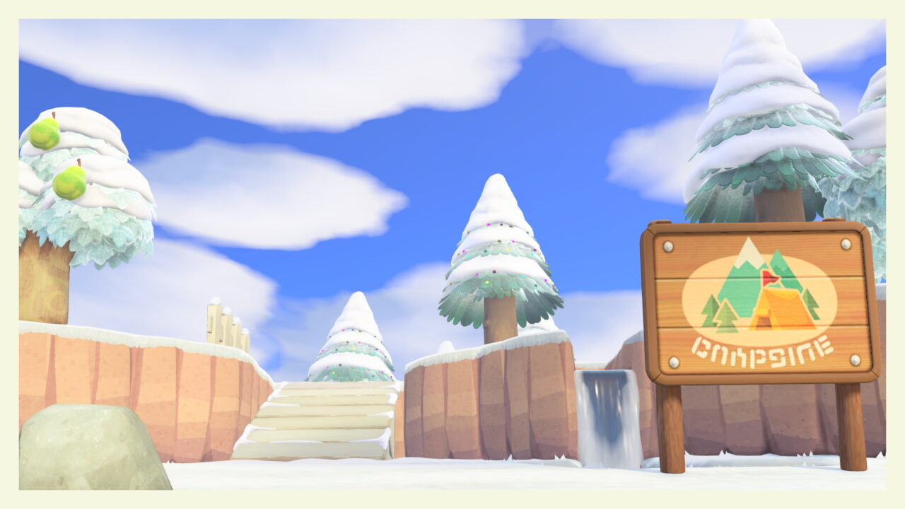 キャンプサイトもメインカラーを意識して道を青白系を選びました。キャンプサイトの道のマイデザインは、ちょっと荒れている感が出てるものを選んでいます。